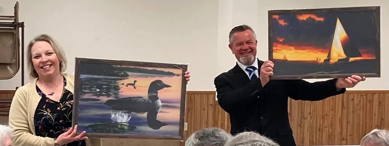 The loon and the sailboat pixel tile art pictured above, along with this beautiful lighted string art picture, the loon, water lily and sailboat pins, our scarves in shades of blue, and the official necktie, are being sold to benefit our charities. See any District Deputy, the WGM or WGP to collect yours!